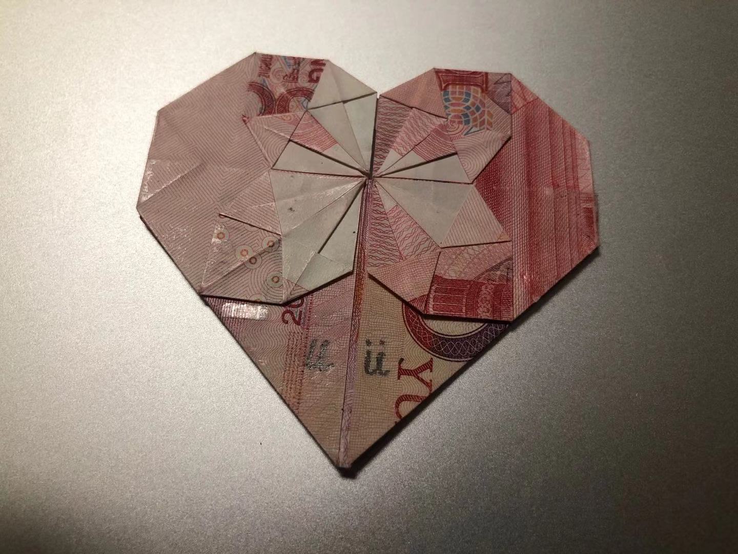 一张纸币叠成的心附上铅笔的签名,既有特定的属于自己的专属的含义,同时又可以被擦除,平淡无奇,看这又是一种冲突